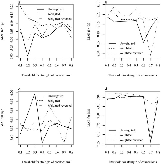 Figure 2 shows that there are no significant advantages in using weighted graphs. A mean absolute error similar in magnitude can also be obtained using unit weights. Based on the results obtained, it is impossible to make recommendations regarding the choice of the threshold value. For IQ2 (Figure 2a), the minimum mean absolute error is reached at a small threshold value. At the same time, for IQ7 (Figure 2c), the error sharply increases with the threshold value 0.3. For IQ3 and IQ8 (Figure 2b,d), the minimum mean absolute error corresponds to the threshold value 0.7.