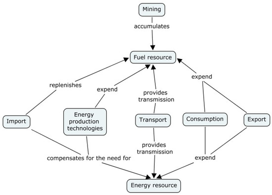 The model for optimizing the balances of fuel and energy resources with the allocation of territorial entities under conditions of possible disturbances in a meaningful sense is based on the traditional territorial production model of the energy sector with blocks of electric power, heat, gas, and coal supplies, as well as oil refining (fuel oil supply). In the mathematical sense, the model is used for solving the general problem of linear programming. When setting the problem, the constraints are written as a system of linear equations and inequalities. The objective function minimizes the amount of losses and damages from fuel and energy resources deficits among consumers. Figure 1 shows the meta-ontology of the model used.
