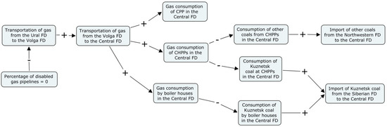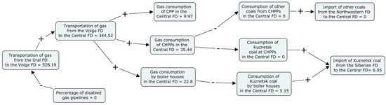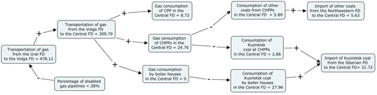 As seen in Figure 6, according to the results of the computational experiment, if 28% of the gas pipeline from the Ural Federal District to the Volga Federal District fails, gas supplies to the Central Federal District can be compensated for by the supply of other coals from the Northwestern Federal District and the supply of Kuznetsk coal from the Siberian Federal District.