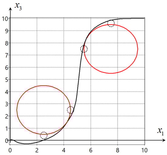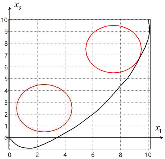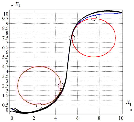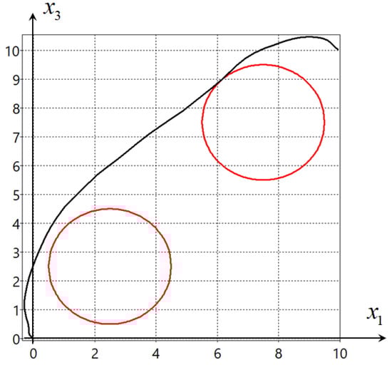 Figure 1 and Figure 2 show projections on the horizontal plane { x 1 ; x 3 } of the two found optimal trajectories. The big circles present the phase constraints in (12).