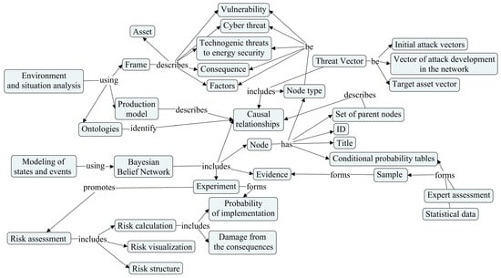 Stage 2. Establishing relations between the concepts. Product rules of type 1 “Asset—Vulnerabilities” establish a relation between an asset and its vulnerabilities. Such rules allow one to output all the rules related to the fact of the asset type without introducing specific vulnerabilities. Type 2 “Vulnerability—Threats” rules associate the relations between asset vulnerabilities and cyber threats that can exploit these vulnerabilities. The type 3 “Threats—Threats” rules add the effect of the relationship between threats, including between a cyber-threat and a cyber-threat and between a cyber-threat and technological threat, on energy security. The generated rules store descriptions of the vector stage for the possibility of implementing the explanation subsystem in the expert system. This stage is in preparation for further topology formation of the Bayesian belief networks and it relates to environment and situation analyses.