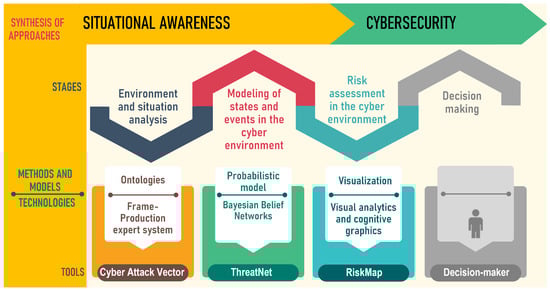 Most of the existing security analysis tools are focused on detecting attacks []. Such tools are usually considered within the framework of the technical component of CSA. Safety assessments and decisions on the provision of safety measures refer to the prediction of what may happen in the future, which is closely related to the cognitive component of CSA. Observation of the current situation and its constituent factors is possible if there is an absence of security []. The assessment of the security of the cyber environment is accompanied by the choice and calculation of security metrics.