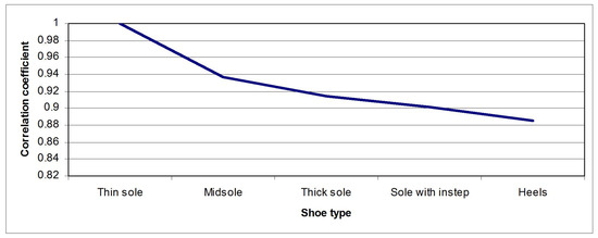 The assessment of gait parameters using wearable devices, in particular a smartphone, is carried out in several stages, which in general can be divided into the following: primary processing of the initial data of the acceleration sensor; the step of determining segment repeating areas that may correspond to walking cycles in the analyzed data; evaluation of the parameters of the selected data sections; and comparison of the obtained results with an individual model that was obtained during previous measurements or based on the base model. Taken together, the steps described are computationally expensive, so some of them can be performed on remote servers. At the stage of primary processing of the initial data, noise and high-frequency noise are eliminated using a set of filters, which can be window functions or wavelet filters [14]. Similarly, negative effects are eliminated, for example, accidental movement of the smartphone, the appearance of bias errors, etc., while smoothing the useful signal and reducing the individual features of measurement and gait, so more complex data processing and analysis are required to eliminate interference and noise [1]. At this stage, the user’s activity level is also detected to separate the gait phases from random movements and amplitude normalization is performed. Depending on the implementation and processing algorithms, some stages are combined, for example, the user activity assessment performed at the primary processing stage is combined with the stage of identifying repeating sections (the so-called data segmentation), or is performed after segmentation, which makes it possible to pre-separate the selected segments by movement type. Separation by types of movement can be carried out on the basis of threshold criteria (selection of action or inaction) on the basis of informative features using classifiers (including neural networks), as well as on the basis of the autocorrelation function. The selection in these areas corresponding to one of the types of cyclic movements (for example, a single or double step when walking) is performed by different algorithms, which are divided into two groups. The first group includes algorithms that are based on the cyclicity of movements and the search for extremums in the data, crossing zero, which correspond to the boundaries of the elements of the cycle (single or double step). This group also includes algorithms that are based on the analysis of the phase of movements, dynamic changes, and correlation analyses. The search for similar areas is carried out with time normalization, for example, using the DWT time warp method. The second group includes algorithms that allow estimating the boundaries of the segments on the “fly” within the time window, which negatively affects the accuracy of marking data sections when changing the temporal parameters of the gait and its individual phases. Selected data sections are analyzed for the presence of informative features and subjected to statistical evaluation of informative time and frequency parameters. Based on the results obtained, an individual model of a person’s gait is built, which is used in the procedures for authentication and evaluation of the parameters of the functioning of the musculoskeletal system. The input segments under study are compared with model templates using correlation and other statistical apparatus or using neural network technologies [15]. It is necessary to evaluate and take into account the influence of external and internal factors on the measurement results when analyzing the received data due to the peculiarities of measuring gait parameters using a smartphone. According to the works of S. Sprager and M.B. Juric [1], the measurement results are influenced by factors that can be classified as informative (useful) and factors that negatively affect the accuracy of the results and which must be compensated for or taken into account in data processing and analysis. Beneficial factors relate to human physiology—these are changes that occur in the human body during its life. These include uncontrolled changes (physiological and psychological) and controlled physiological and psychological changes [16,17,18]. Negative factors include the type of clothing and footwear, the parameters of the base on which the person walks, the uniformity of distribution of the additional load on the person or its absence, etc. Negative factors distort the measurement results, for example, when the phone makes random movements in the pocket of loose clothing or a bag. At the same time, some factors may also be useful (informative), corresponding to a certain style of gait in certain conditions. For example, the type of footwear is a negative factor and changes the natural gait of a person (transition from boots to shoes with long heels), but under these conditions, the gait still remains individual. For example, Figure 1 shows a graph of the change in the value of the correlation coefficient when comparing the waveform of the accelerometer of a smartphone (placed in the front pocket of a pair of trousers) when walking in trousers with different degrees of tightness. All measurement conditions, except for the different types of pants, were the same and the results were averaged. According to the results of the analysis of the graph in Figure 1, it follows that the type of pants when walking affects the shape of the accelerometer signal, distorting the signal by up to . This can be misinterpreted and a decision may be made on the distortion of gait parameters, while the gait remains unchanged. Figure 2 also shows a graph of the change in the value of the correlation coefficient when comparing the accelerometer signals of a smartphone (placed in the front pocket of a pair of trousers) when walking in shoes of various types. Changing shoes distorts the shape of the accelerometer signal by up to . Figure 1 and Figure 2 show special cases from the data o