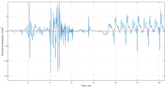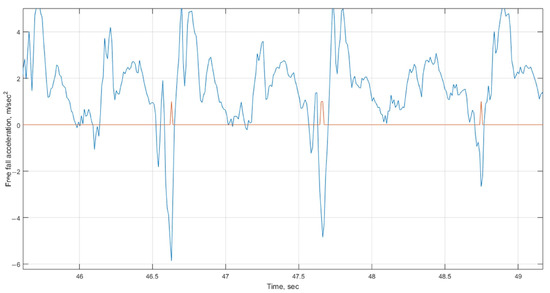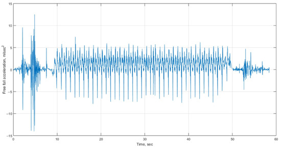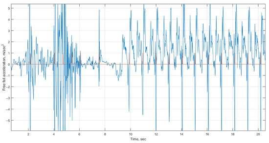 In everyday life, such situations do not occur, so different factors can appear at random times and have a random degree of impact, i.e., in processing and analysis, it is difficult or impossible to accurately assess the components that affect the measurement results. From the position of automating the processing of measurement results, the main task is to select data sections corresponding to gait or other analyzed movements. Figure 3 shows a simple example of a time series of smartphone accelerometer data. The central section corresponds to the walking of a person, and in the extreme sections there are random, interfering movements. When segmenting this time series (for example, by extrema), interfering movements often fall into the category of informative signals, which correspond in duration to informative sections (in Figure 4 the boundaries of informative sections are marked in red).