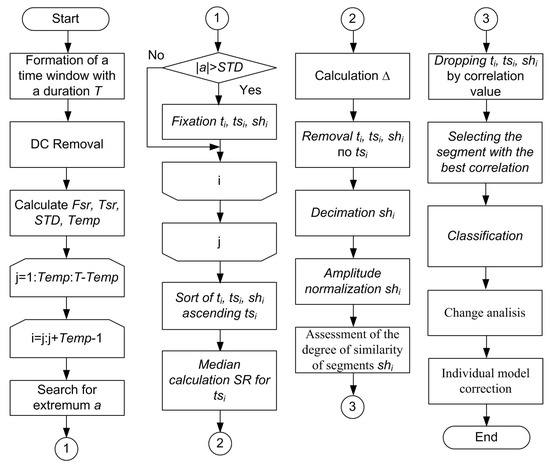 In addition to this, when processing a time series with a window function during segmentation, situations arise when one movement corresponds to two time windows with its subsequent division into two movements. An example can be seen in Figure 5 (flat peak of the red mark), where the central section corresponding to one movement falls into two time windows due to the edge of the time window hitting the extremum. To reduce the problems described above, the authors propose an algorithm (Figure 6) for processing smartphone accelerometer measurements. For the high-quality operation of the algorithm, it is necessary to accumulate measurements from the smartphone accelerometer over time T. In authentication systems and personalized medicine, in terms of gait parameters, even a few minutes is not critical, since time series and statistical indicators of gait parameters are analyzed. As specified earlier, in such systems, more attention is paid to the reliability of the estimates obtained, which means a decrease in the number of negative factors in the processing results. The developed algorithm selects areas with the best quality for analysis and accumulation in the template database. The quality criterion is the maximum value of the correlation coefficient. The data section, which in the time domain is most similar to others, carries the least distortion and reflects the constancy in gait over the analyzed period. The quality of the selected areas simplifies the correction of the individual model and improves the accuracy of clustering and classification. In the first steps, the algorithm performs data preprocessing within the analyzed time T; the standard deviation is found after subtracting the constant component, the period is determined, and the local time window is formed based on the amplitude spectrum. The local window , the doubled period of the harmonic , which has the maximum amplitude in the spectrum, is taken: