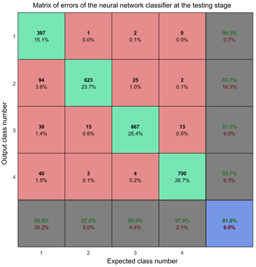 The application of the developed algorithm increased the reliability of the obtained estimates and the quality of intermediate data at the stage of primary processing (Figure 7). At the stage of primary processing, data sections were selected that relate only to useful data (analyzed movements during walking) and no duplication of sections was found. As a result of the correlation processing of the selected sections, heavily noisy sections were removed that corresponded to random movements not related to the analyzed ones, as well as sections that had distortions, reflecting stumbling while walking, stopping and changing trajectory, the type of movement, etc. When constructing the neural classifier, feed-forward networks were used; their training was carried out by the gradient descent method with cross-entropy as an optimization criterion. The activation function for the hidden layers was the sigmoid and for the output layer it was the normalized exponential function. Testing a neural network classifier with at least 100 hidden layers on a test set showed a correct decision probability of . Reducing the number of hidden words to 10 led to a decrease in the probability of correct decision making to (Figure 8). The classification of the subject’s own movements was .