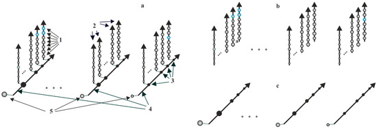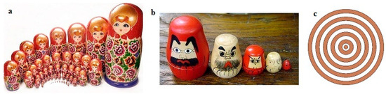 There are several versions of the origin of the Russian matryoshka (Figure 1a). According to the most plausible version, the idea—matryoshka—was borrowed from the compound Japanese toy Fukuruma (Figure 1b). The ancient elder Fukuruma is a revered Japanese pantheon deity of the seven gods responsible for luck, happiness and prosperity. The good sage’s appearance is quite specific: an armless and legless body, shaped like an oval body-head, slightly stretched up and decorated with a beard and eyes. The eight copies inside are eight human bodies. This is allegorical, since the ancient sages believed that each person has several “shells”. In the context of this study, both the Russian matryoshka and the Japanese Fukuruma model a single-inclusion hierarchy, in which each object contains only one object of the lower level (Figure 1c). The smallest object is monolithic.