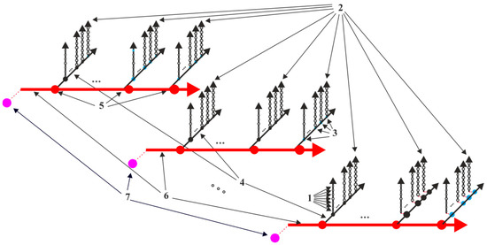 Hypervector ranking scheme : 1—l scalar components of vector criterion ; 2—ranked vector criteria ; 3—k ranks of vector criteria ; 4—n vector criteria rank vectors; 5—n ranks of multi-vector criteria ; 6—multi-vector criteria rank vectors; 7—m ranks of hypervector criteria .