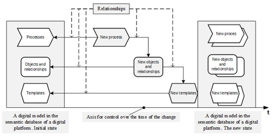 The second methodological approach is based on the concept of a document model in terms of semantic modeling [26]. Within the framework of this concept, a special place is occupied by the change management process, which is compared with the management process of implementing the Intent Level Control process into the IT infrastructure of a digital platform in a transpositional structure. At the same time, in accordance with the research topic discussed in this article, a change is understood as a set of formalized procedures for implementing the Intent Level Control process into the IT infrastructure of a digital platform in a transpositional structure.
