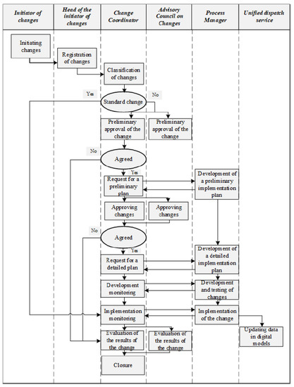 Initiator of changes is a role as a result of which a new change is initiated, while the following functions are implemented: formation of a change request; registration of a change request; providing additional information regarding the requested change; visualization of the results of the change and closing the request.