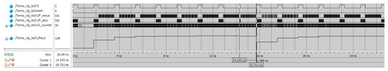The diagram shows the transient process, during which the transducer reaches the equilibrium mode. Starting from the fifth period of the input signal , the transducer keeps the output code unchanged. This code is the result of the execution of transformations. At the moment of 14.243 ns, an interference occurs, which leads to a shortening of the signal duration . After three periods, the converter returns to the equilibrium mode, compensating for the failure by triggering the feedback.