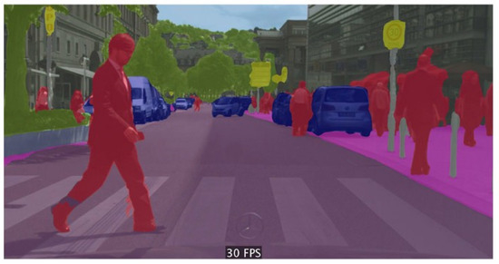 In this case, segmentation is the process of selecting segments of an image. The initial image is used as the input of a neural network and an image of the same size is formed at its output, with each of its pixels represented as a color that corresponds to the object that this pixel belonged to in the original image (Figure 4).