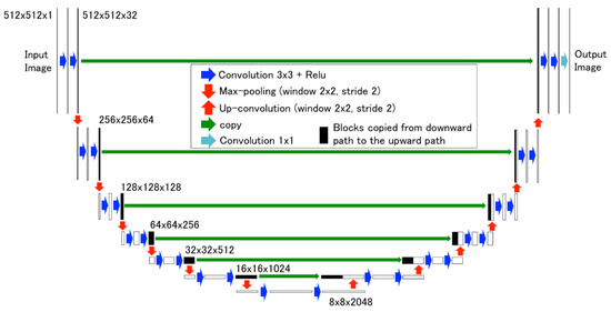 The most effective current neural networks for solving the problem under consideration are networks of the “encoder–decoder” class, such as U-Net [16,17,18]. Below, we consider the principles of its operation in more detail (Figure 5).