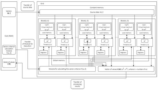 Step 4. The kernel is called with a subsequent transfer from the CPU to each thread of a set of instructions for execution. Threads start to work in parallel. Within each thread, the corresponding set of values of the vector criterion is calculated for each and the extreme pessimism point is calculated on the set , which is stored in the local memory of the thread. Upon completion, each thread transfers its value to the global memory of the GPU. After the GPU has signaled that all threads have terminated, the CPU moves the array from the GPU’s global memory to the CPU’s RAM.