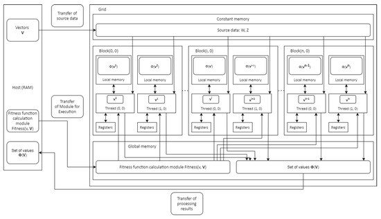 Step 7. The kernel is called and threads are started to work in parallel. Within each thread, the corresponding value of the fitness function is calculated for each element of , which is stored in the local memory of the thread. Upon completion, each thread transfers its value to the GPU’s global memory. After the GPU sends a signal to terminate all threads, the CPU transfers array from the GPU’s global memory to the CPU’s RAM.