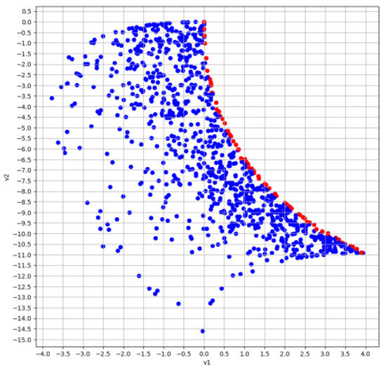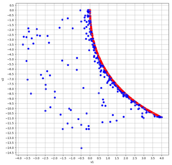 Figure 3, Figure 4 and Figure 5 show the results of searching for a set of vector maximins using the HEA MCOU (elite points in each generation are highlighted in red). Algorithm parameters: population cardinality ; ; real coding and SBX-crossover were used.