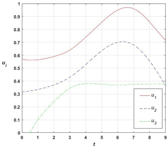 The components of the subvector are the nodal points of the natural cubic spline , . The graphs of the components of the program control law are shown in Figure 2. The corresponding trajectory is shown in the Figure 3.