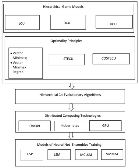 Stage 2. Development of a library of multi-criteria optimization hierarchical coevolutionary algorithms (HCEA) under conflict and uncertainty. HCEA’s structure corresponds to the structure of hierarchical game models of optimization. This provides a flexible algorithm adjustment for the realization of conflict interaction of various types and conflict optimality principles as well as their integration in the formation of STECU and COSTECU. In addition, the hierarchical structure of coevolutionary algorithms best corresponds to the capabilities of distributed computing technologies. All this together provides a significant synergistic effect.