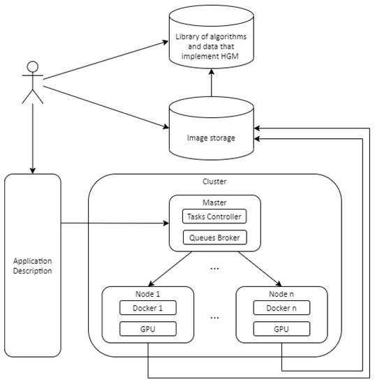 Stage 3. Development of a software package for the synthesis of neuro-gaming control models based on the HCEA library, Docker and Kubernetes [26,27] platforms, graphics processors [28,29], a library of neural network ensemble learning models (NNE). The Docker platform is used for the development, deployment and launch of container applications. The Kubernetes platform is a tool for scaling, managing and coordinating the functioning of containerized applications in a cluster environment. Figure 2 shows the generalized architecture of the neuro-evolutionary synthesis (NES) hierarchical control models (HCM) software, which includes the following structural and functional components.