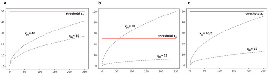 Let us denote the vector of stresses (which are also often referred to as covariates) as . The range of values for each covariate is determined by the conditions of the experiment. In this paper, the degradation process is supposed to be observed under a constant time stress. Here, we assume that the covariate x influences the degradation paths as in the accelerated failure time model: