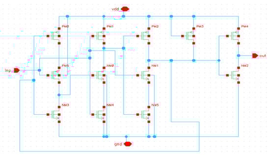 The output of the VCO is provided to the PFD via the frequency divider circuit. The frequency of the VCO output signal is divided by two by this frequency divider block [15]. Two D flipflops constructed using 5 NMOS and 5 PMOS transistors are used to implement the divider circuit, as shown in Figure 6.