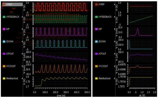 Figure 8 shows transient and DC analysis of the proposed PLL that verifies the working of the PLL in an effective way. This not only shows the output PFD, i.e., UP and DOWN signals that act according to the clock signal but also show the output waveforms of the charge pump which varies according to the input signals. When both the input signals i.e., REF and FEEDBACK are high, the output of the charge pump is high; when both the input signals are low, there is a drop at the output signal of the charge pump, which is given as input to the VCO.