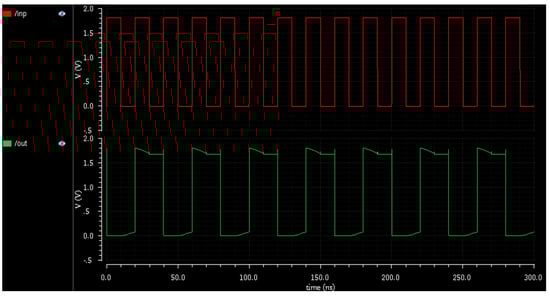 Figure 11 shows input and output of the frequency divider. Visibly, the output pulses have half the frequency of the input pulses. In other words, the input frequency is divided by the frequency divider by a factor of 2.