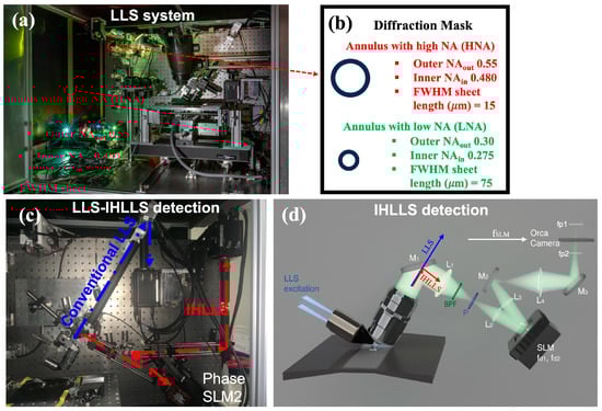 Figure 1. (a) The LLS instrument [8]; (b) the diffraction annular mask filters of inner diameter, NAin, and outer diameter, NAout, to filter out undiffracted light and unwanted higher diffraction orders; (c) the detection arms for the LLS instrument with the IHLLS detection arm incorporated; and (d) optical schematics of IHLLS. The LLS and IHLLS with HNA use higher NAout and a shorter light sheet (more like Bessel beams), here NAout = 0.55, NAin = 0.48, and sheet length 15 μm. The LLS and IHLLS with LNA use lower NAout and longer light sheet (more like Gaussian beams), here NAout = 0.3, NAin = 0.275, and sheet length 75 μm. The detection magnification Mdet = 62.5 and the illumination wavelength λ e x c i t a t i o n n = 488 nm. The LLS, or IHLLS 1L with one diffractive lens, fSLM = 400 mm, are used for calibration purposes. The IHLLS 2L with two diffractive lenses, fd1 = 220 mm and fd2 = 2356 mm, are used for incoherent imaging. Lenses L1=L4 with focal lengths 175 mm, L2=L3 with focal lengths 100 mm; mirrors M1, M2, M3; fp1 and fp2 are the imaging positions of the two diffractive lenses, fd1 and fd2.
