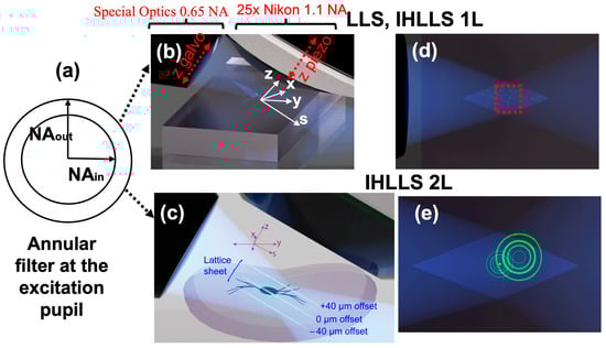Figure 2. Excitation and scanning geometry in LLS, IHLLS Systems. (a) The diffraction mask is conjugated with the BFP of the excitation objective; (b) the scanning geometry in LLS and IHLLS 1L, the z−galvo and z−piezo are moved along the z axis to acquire imaging stacks; (c) The scanning geometry in IHLLS 2L; the z-galvo is moved at various z positions but the z-piezo is kept fixed; (d) The FOV in a conventional LLS system or the incoherent version with one diffractive lens, with dithering scanning modality and HNA, is about 52 × 52 μm2 (red area); (e) the diffractive lens effect in IHLLS 2L system. Excitation objective: Special Optics 0.65 NA, 3.74 mm working water dipping lens; detection objective: Nikon CFI Apo LWD 25×—water dipping, 1.1 NA, 3 mm working distance.