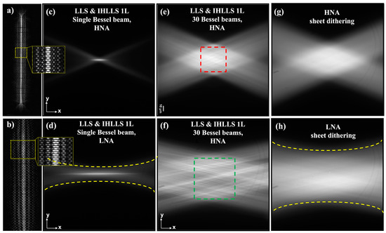 Figure 3. Optical lattice generation using HNA and LNA annuli; (a) HNA, 30 Bessel beams optical lattice with 0.99 spacing; the width of the light sheet in the center of the FOV is about 400 nm; (b) LNA, 26 Bessel beams optical lattice with 1.755 spacing; the width of the light sheet in the center of the FOV is about 800 nm; (c,d) Single Bessel beam at the sample plane; and (e,f) the Bessel beams corresponding to the optical lattices from (a,b) at the sample plane. The scanning area in a conventional LLS (HNA) is at best 52 × 52 μm2 (red square in (e)), and in a conventional LLS (LNA) about 78 × 78 μm2 (green square in (f)); (g,h) The Bessel beams corresponding to the optical lattices from (a,b) with the dithered mode at the sample plane.