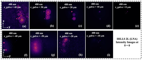 Figure 5. IHLLS 2L 500 nm beads holography, intensity images at phase shift, θ = 0; z-galvo position: (a) 40 μm, (b) 30 μm, (c) 20 μm, (d) 10 μm, (e) 0 μm, (f) −40 μm, (g) −30 μm, (h) −20 μm, and (i) −10 μm.