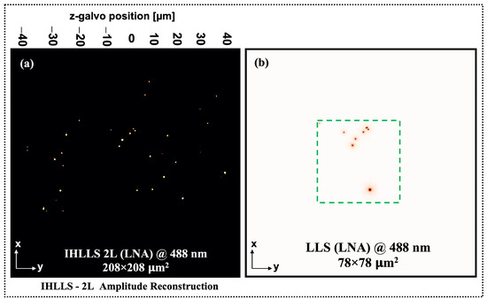 The max projection of all z-planes where the beads were found are displayed in Figure 6a. They show the complex holograms propagated to the best focal plane. We observed that IHLLS 2L performed better in comparison to the conventional LLS system in dithering mode regarding the scanning/detection area. The scanned area with detected beads in an IHLLS 2L system with LNA is the full FOV of the CMOS detector while the scanned area with detected beads in a LLS system with LNA is about 78 × 78 μm2. In terms of axial resolution, we already showed [9] that the axial resolution of IHLLS 2L was higher than that of LLS because the objects are localized with greater precision using diffraction software packages.