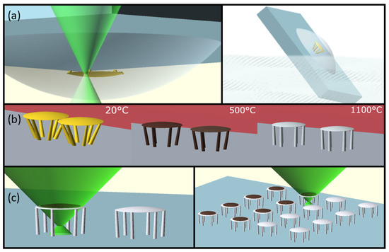 Therefore, the goal of this paper is to fabricate suspended and functional structures, Figure 1a, in this case, microlenses, heat-treat them, Figure 1b, and confirm the useful increase in LIDT, Figure 1c.