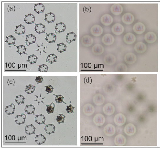 Optical characterization of micro-optics using an inverted microscope: (a) image of the surface of the optic components, (b) an image of the focal position (300 μm) of the same micro-optics, (c) bright-field image after damage, (d) degradation in image quality in the focal position of damaged lenses.