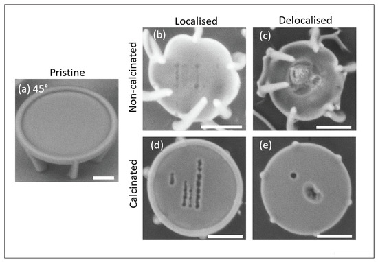 The observed damage morphology is shown in Figure 3. For comparison, an example of a pristine lens is given in Figure 3a. Such a lens initially is of 50 μm in diameter and, after calcination, shrinks down to 30 μm. The localized damage protocol produces small damage sites. The delocalized-damage protocol produces large damage sites for NCA lenses (Figure 3b). In this case, the lenses lose their imaging function as most of the aperture becomes distorted. The damage is technically catastrophic. On the other hand, the CA lenses shown in Figure 3d,e retain their qualitative imaging function and feature small diameter ablation sites reminiscent of fs-laser surface ablation. The morphology does not differ in any meaningful manner independent of the wavelength used. The only observed difference for NCA lenses is that brown discoloration is prominent, especially for nm.