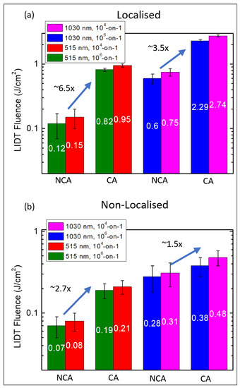 The measurement results of LIDT values are summarized in Figure 4. We analyzed a combination of cases of localized and nonlocalized damage protocols, NCA and CA, -on-1 and -on-1, and 515 and 1030 nm wavelengths. The NCA localized damage results correspond well in the margin of error with the ones presented in the literature: J/cm and J/cm.