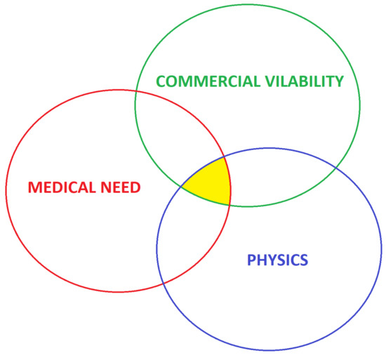 The proper implementation of medical practice needs information. In the diagnostic and management of patients, one starts with the history of the symptoms, followed by the physical examination. When the human senses are not sufficient, special tests come next. Medical diagnostic imaging is there to “see” when the examiner’s senses are not enough. Any diagnostic imaging tool that comes into common use satisfies three criteria; it can be produced, it fulfills a diagnostic need, and it is financially viable. The “sweet spot” is where the physics, medical need and commercial viability intersect (Figure 1).