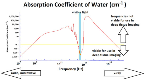 The dead hand of physics limits what is achievable. As Scotty from Star Trek was prone to say, “Ye cannae change the laws of physics”; medical diagnostic imaging tools are bound by what is physically possible. The realms of physics available for diagnostic use can be classified as electromagnetic waves, pressure waves and temperature. Humans are 60% to 65% water; thus, the physics of water becomes a dominant determinant. The absorption coefficient (α) of water, with respect to electromagnetic waves (in terms of cm−1), is presented in Figure 2. The penetration depth (Dp), the depth at which about 37% of the radiation into water survives, is given by Dp = 1/α. An α of 1.0 cm−1 gives a Dp of 1.0 cm, and for an α of 100 cm−1, the Dp is 0.01 cm. For electromagnetic radiation to be useful as a deep tissue diagnostic modality, it needs to traverse the body, which means an α of 0.1 cm−1 or less.