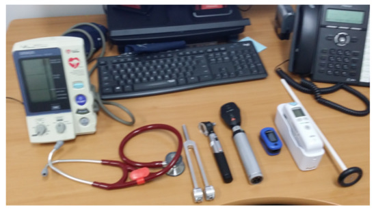 A typical medical office toolkit. From the left: the electronic sphygmomanometer, stethoscope, tuning fork, otoscope, ophthalmoscope, pulse oximeter, ear thermometer, tendon hammer.