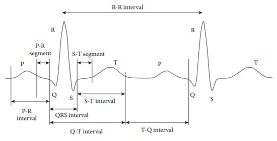 Normal sinus rhythm (NSR), often known as a regular heartbeat, is present in healthy hearts [,,]. Atrial depolarization is indicated by P-waves. Regular Q waves indicate septal depolarization and are an early descending deflection of the P wave. The ECG’s most common waveform for identifying and detecting early ventricular depolarization is the R wave. which shows the late ventricular depolarization [,]. Ventricular repolarization is characterized by the T-wave. The Purkinje fibers that show the most recent ventricular residuals, or U waves, repolarize.