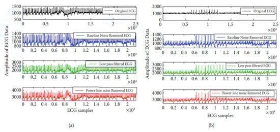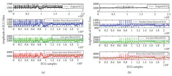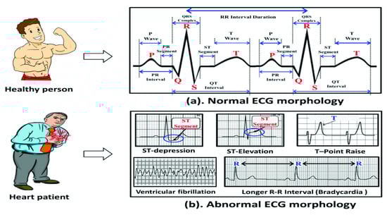 The majority of people today aged between the ages of 40 and 60 experience cardiac-related health problems. An electrocardiogram is the best way to capture heart impulses and identify any abnormalities at an early stage, as demonstrated in Figure 2a, showing anormal ECG, and Figure 2b, showingan abnormal ECG. The heart rate variability and QRS complex are used to classify the abnormalities []. For the purpose of removing motion distortions from the ECG data, numerous authors have put forth various methods. The aforementioned techniques include wavelet transforms (WTs), adaptive filters (AFs), and empirical mode decomposition (EMD) []. Blanco-Velasco proposed an ECG enhancement technique to remove baseline drift and noise brought on by high frequencies. On the other hand, mode mixing, which yields erroneous intrinsic mode functions, is one of the prevalent problems in empirical mode decomposition.