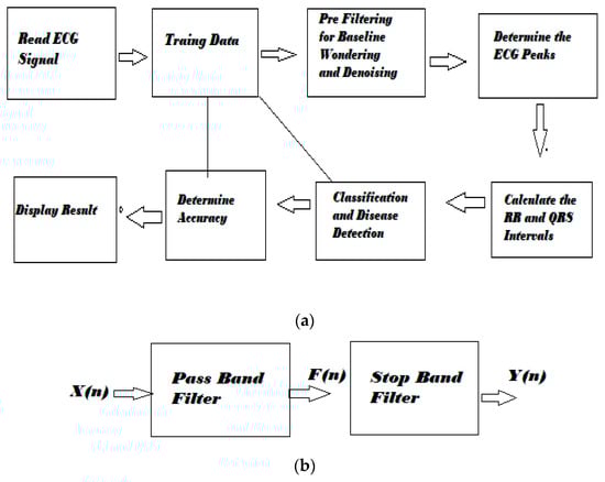 It is recommended to use the optimization method in order to bring down the expected order of the IIR filter design. A block diagram of the proposed ECG categorization algorithm can be found in Figure 3a. In the proposed IIR filter, which is a two-stage filter, the pass band filters and stop band filters are laid out in the manner that is depicted in Figure 3b.