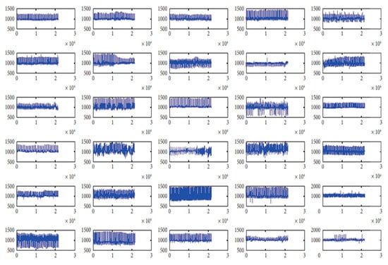 The 30 ECG data, which contain a wide variety of ECG data, were chosen for the current investigation out of the 48 channels that humans have available. Figure 4 displays the input ECG data. At a rate of 360 samples per second, the following ECG data were captured. The ECG information is displayed in Figure 5a–f. The ECG data show the most erratic variations in these channels. Therefore, it is important to show how well the peak detection method works against them. These channels were chosen for another reason; several ECG peak detection techniques already in use, such the ones in Refs. [,,,,,,,,,,], also take them into account.