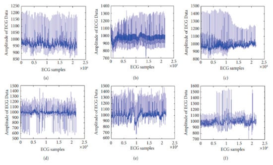 For perceptual result representation, six distinct ECG data with various feature difficulties were taken into account: (a) 102, (b) 106, (c) 109, (d) 200, (e) 208, and (f) 228.
