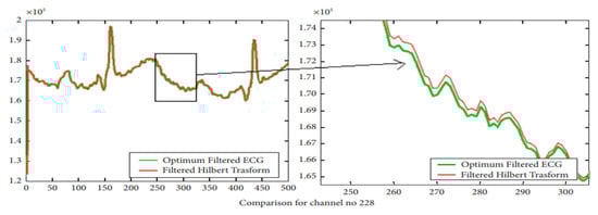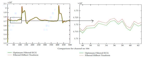As communication technology has developed, wireless communication has become one of the most popular ways for people to conveniently exchange ideas and thoughts. An audio noise-reduction system is a technique for eliminating noise from audio transmissions. Devices for audio noise reduction use two main strategies. The complementary type calls for carefully removing the audio signal before recording (primarily on tape) [,,,,]. The relative weight that the filter assigns to data samples is determined by these settings. Typically, to accomplish this, particular frequencies or frequency ranges must be eliminated [,,,,,,,]. Contrarily, filters have a wide range of extra aims, particularly in the area of image processing. They do not merely operate in the frequency domain. There is no apparent hierarchy, but there are many classification systems, all of which overlap in different ways. Filters come in both linear and nonlinear varieties. The system’s properties include shift invariance, which is sometimes known as time-variant or time-invariant [,,,]. A filter that operates in a spatial domain is said to be space invariant. The filters that handle time- or spatial-domain signals are slow in time [,]. Unlike continuous-time filters, which can be both active and inactive, discrete-time filters can only be active or inactive. This study illustrated the effective use of an optimization-based filter for identifying and categorizing ECG peaks. It participated in both passes. In the first pass, a useful lower-order IIR filter design method based on transfer function optimization was suggested for detecting QRS peaks. For peak detection performance improvement, the IIR filter and Hilbert transform was used. Three distinct approaches were tested for their filtering effectiveness for baseline wondering.