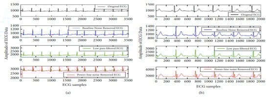 For collected more samples, ECG signal pre-processing is plotted for the (a) 101st ECG data and (b) 106th ECG data.