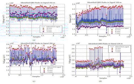 From Figure 10a–d, we are analyzing QRS peaks in signal 102 m, 109 m, 208 m and 228 m.