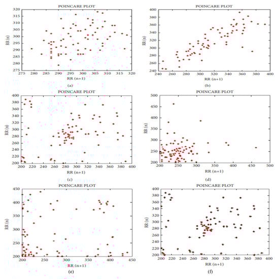 (a–f) Results of HRV analysis for point on the plot is represented by the value of each subsequent pair of RR intervals.