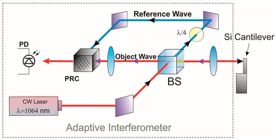 The micro-mechanical biosensor was created using an AFM silicon cantilever, which served as the main element of the biosensor. The cantilever had dimensions of 125 × 30 × 2.5 µm3 and was mounted on a positioning system. To excite vibrations, the cantilever was fixed on a piezoquartz plate and subjected to a sinusoidal electrical signal with an amplitude of up to 80 mV and varying frequency, supplied from an electrical signal generator. The vibrations of the cantilever were measured using a holographic adaptive interferometer [7,8], as shown in Figure 1. The interferometer object wave was reflected from the cantilever and propagated through a semi-insulating photorefractive CdTe:V crystal, where it was mixed with the reference wave. The wave coupling ensured phase-to-intensity transformation in the object wave, and changes in the intensity were recorded using a photodetector connected to an electrical signal spectrum analyzer that was synchronized with the electrical signal generator. Thus, the feedback spectra of the micromechanical sensor were recorded.