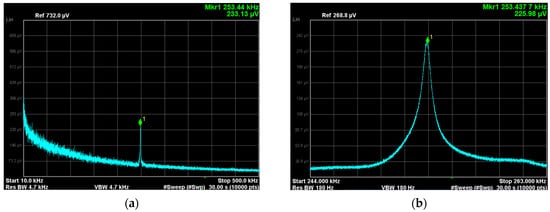 The interferometer used a continuous laser with a wavelength of 1064 nm. The cantilever was coated with a 20 nm thick gold film via electron beam evaporation to improve the reflection of the object beam of the interferometer, thereby increasing the signal-to-noise ratio of the measuring system. The spectrum recorded using the electrical signal spectrum analyzer is shown in Figure 2a, and a resonant peak is clearly visible (Figure 2b), corresponding to the frequency of natural oscillations of the cantilever. To determine the oscillation frequency, the spectrum was processed in OriginPro software via approximating the resonance peak with a Gaussian curve. The measured resonance frequency of the cantilever used in this work was 253,442 ± 23 Hz.